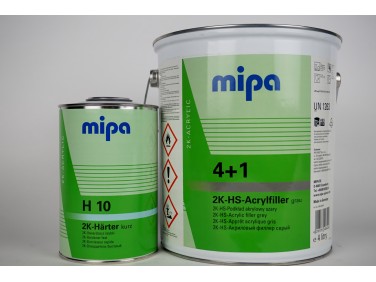 Podkład Mipa 4+1 Acrylfiller HS jest produktem o dużej sile wypełnienia, łatwym do szlifowania. Stosuje się go jako podkład wypełniający grubowarstwowy lub cienkowarstwowy. W połączeniu z Mipa 2K-Reaktivzusatz VR możliwa jest ekspresowe suszenie w temperaturach pokojowych lub w podwyższonej temperaturze. Zapewnia duże oszczędności w przepustowości kabiny lakierniczej, suszeniu piecowym oraz czasach pracy. Znajduje zastosowanie w niewielkich naprawach (Spot-Repair), nie tworzy brzegów i „nie siada”. Kolejną możliwością dzięki zastosowaniu dodatku Mipa 2K-Reaktivzusatz VR jest obróbka mokry-na-mokry. W tym przypadku po 10 minutach suszenia podkład może być polakierowany.